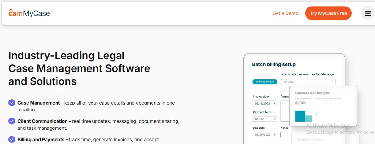 | MyCase | Client communication | $49/month per user | 10 days | Stronger client portal | Built in client portal |